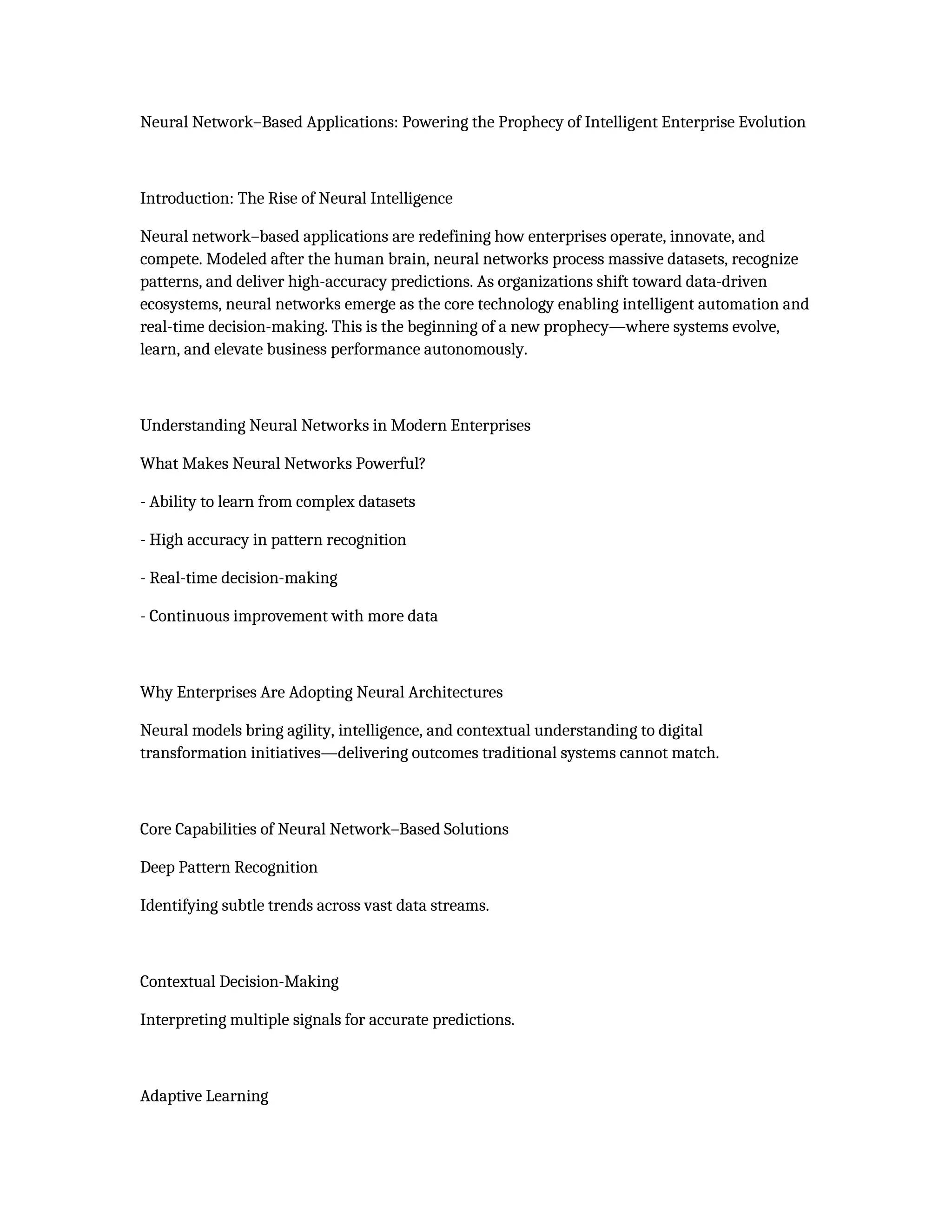As enterprises generate increasing volumes of multimodal data, neural network–driven systems deliver the intelligence required to convert complexity into clarity. They empower organizations to build resilient, responsive, and future-ready operations where insights are timely, decisions are precise, and innovation becomes continuous.