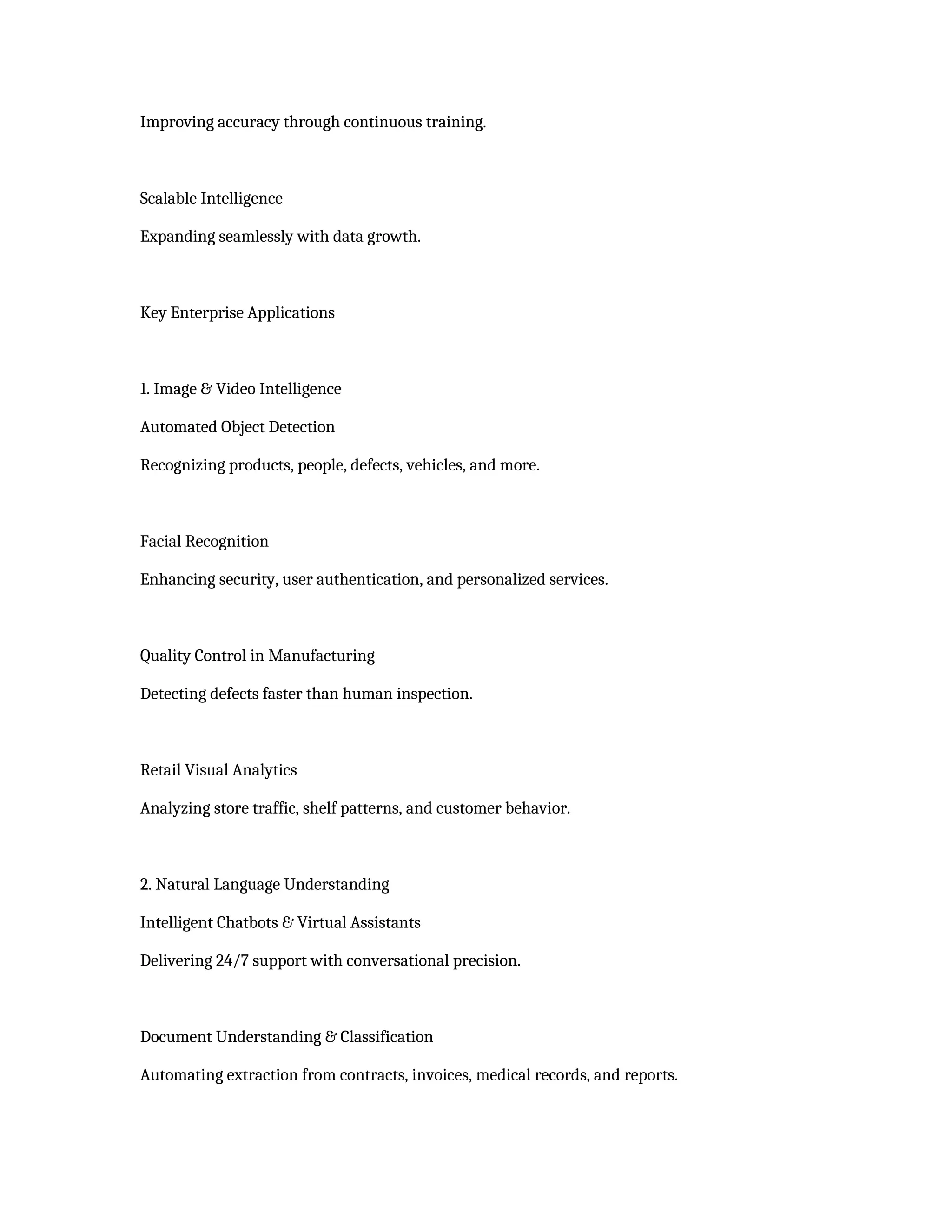 Neural network–driven systems enable advanced capabilities such as intelligent search, document understanding, fraud detection, personalized recommendations, and predictive maintenance. Their adaptability allows them to evolve with new data, ensuring continuous improvement in forecasting accuracy, operational efficiency, and risk mitigation. This positions them as a strategic asset for digital transformation initiatives.