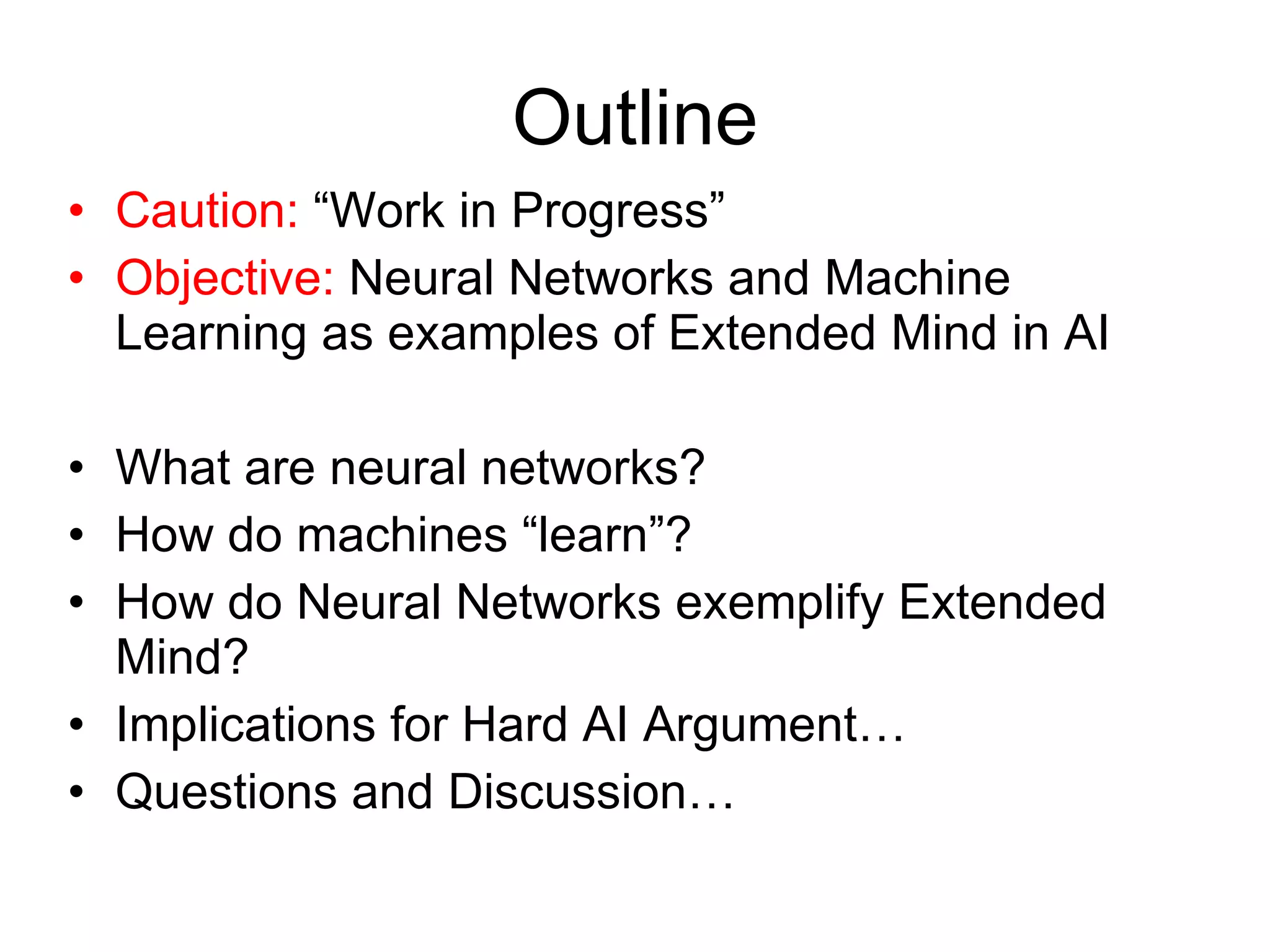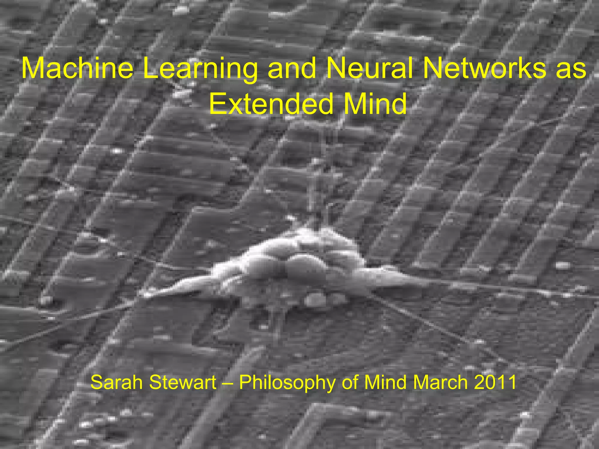 The document discusses the concept of neural networks and machine learning as extensions of the mind in artificial intelligence, presenting ideas from the philosophy of mind. It explores how machines learn from sensory data and environmental cues, comparing this to biological cognition and the implications for hard AI. The author argues that neural networks exemplify the extended mind by processing external information and shaping cognitive responses.