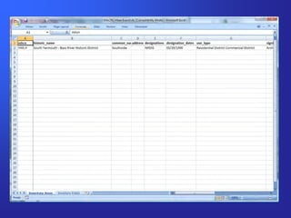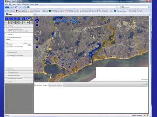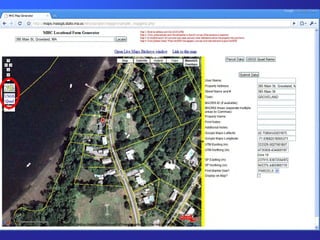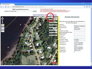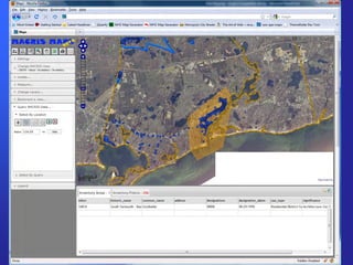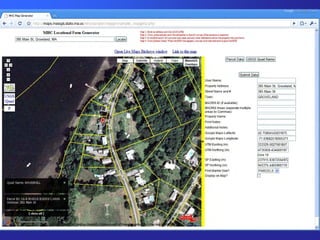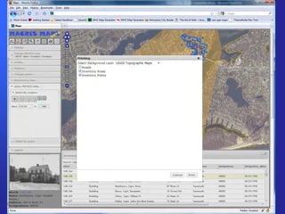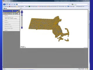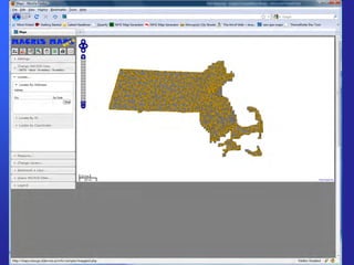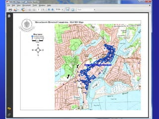 The document summarizes the web mapping activities of the Massachusetts Historical Commission (MHC). The MHC uses web mapping to facilitate exploring and accessing its inventory of historic and archaeological sites. It maintains a web GIS allowing users to view, query, and export data from its inventory alongside other datasets. The MHC has improved its web GIS over time, moving to open source technologies like OpenLayers to make the system faster, more flexible, and under its own control.