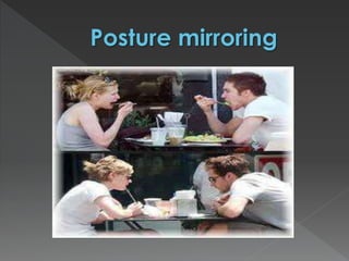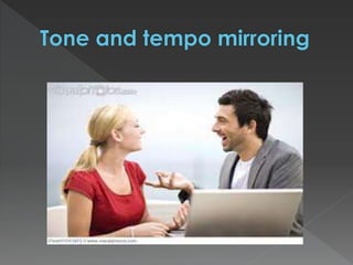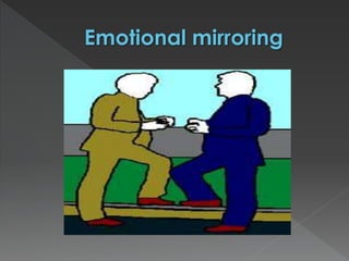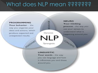 This document provides an overview of Neuro-Linguistic Programming (NLP). It discusses how NLP studies excellence in fields like communication, psychotherapy, and education to understand the interaction between neurology, language, and behavioral programming. The six principles of NLP are outlined, including rapport, outcome orientation, sensory acuity, and behavioral flexibility. Building rapport through mirroring body language, words, and other behaviors is described as a way to connect with others.