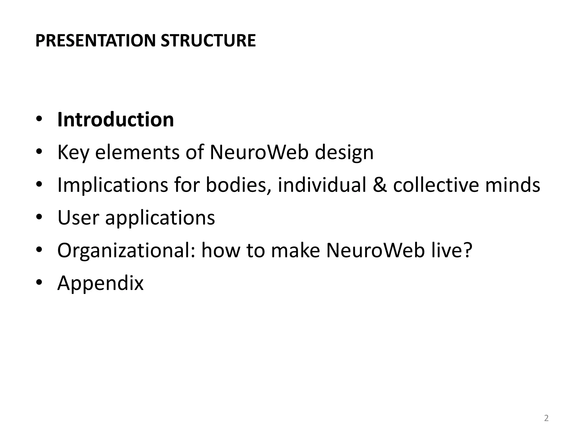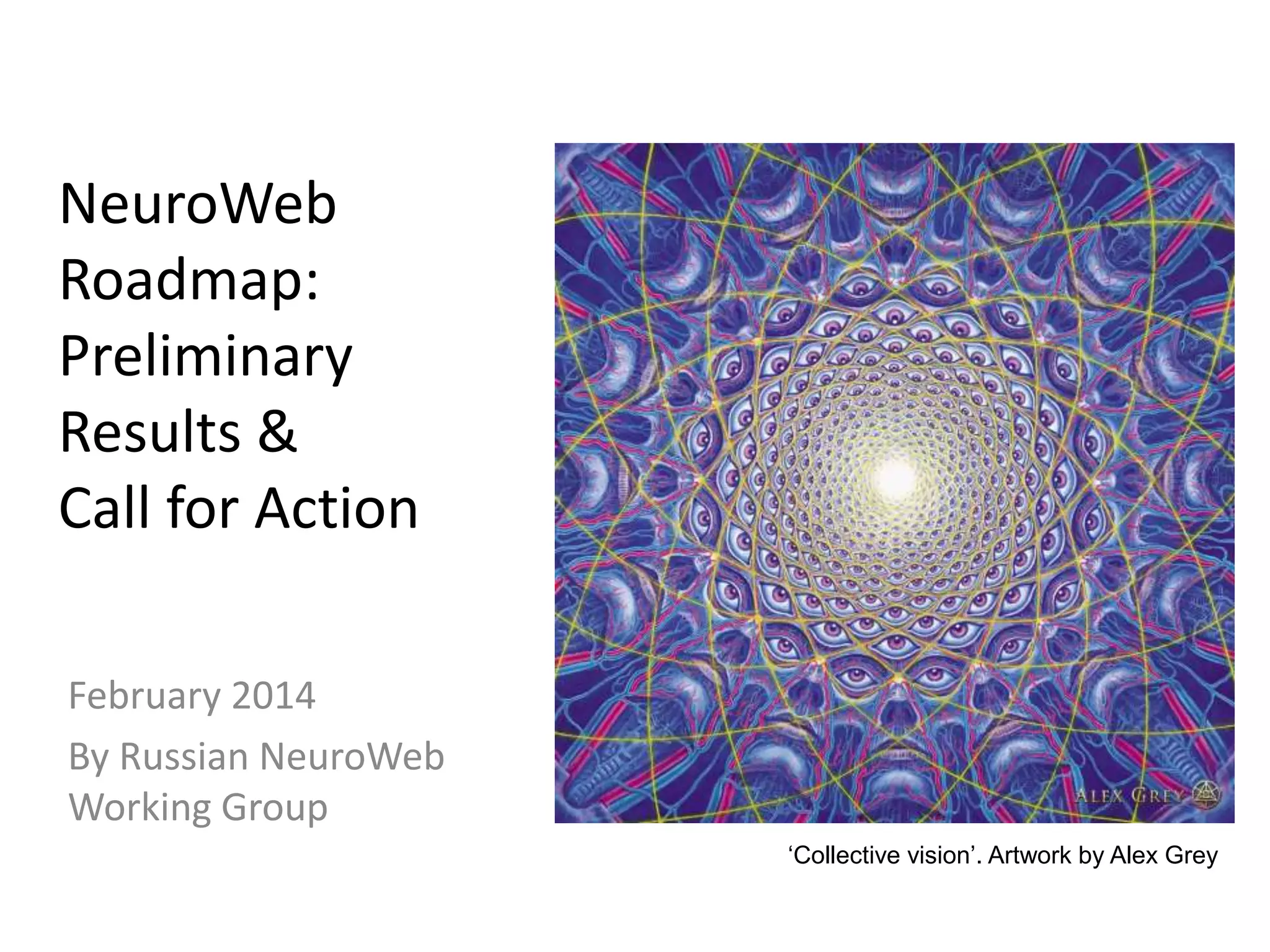 - The document proposes forming an international working group to help guide research and development toward the emergence of commercially viable NeuroWeb technologies.