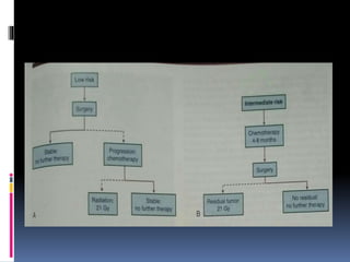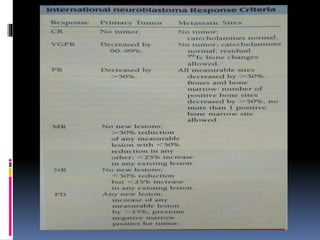 Neuroblastoma is the third most common childhood cancer. It arises from neural crest cells that form the adrenal medulla and sympathetic ganglia. Risk factors include genetic mutations and amplification of the MYCN oncogene. Diagnosis involves biopsy and imaging like CT, MRI and MIBG scan. Treatment depends on risk stratification and may include surgery, chemotherapy, radiotherapy, stem cell transplant, retinoids and immunotherapy. Prognosis is best for low risk disease and worst for high risk disease characterized by MYCN amplification and older age.
