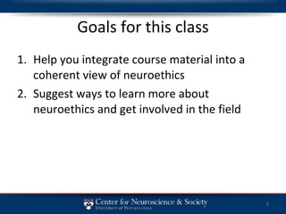 This document introduces neuroethics and outlines some of its key topics and issues. It discusses the goals of integrating course materials and suggesting ways to further involve oneself in neuroethics. Some areas covered include classical bioethics concerns, emerging technologies that monitor and manipulate the brain/mind, and debates around personhood, enhancement and privacy. Cross-cutting issues like safety, autonomy and premature adoption are also noted. Students are encouraged to continue learning through relevant publications, websites and future neuroethics society meetings.