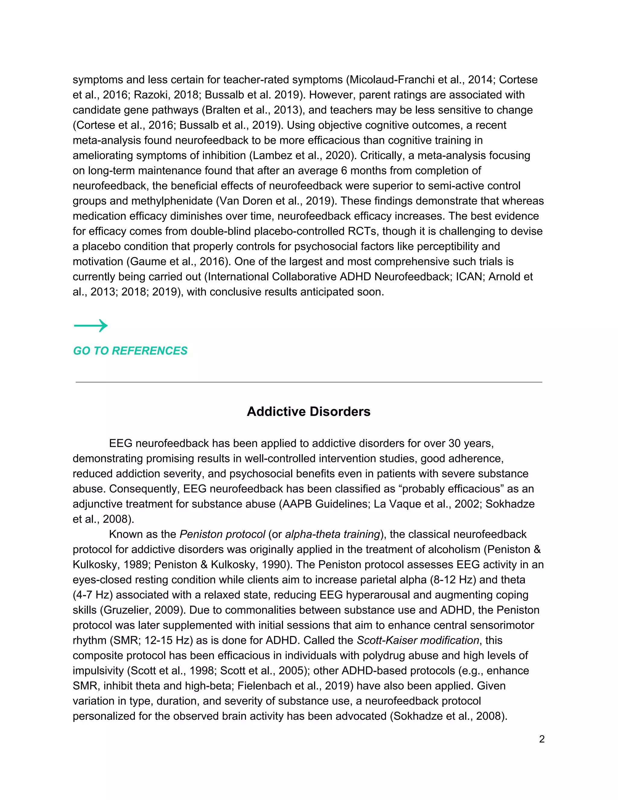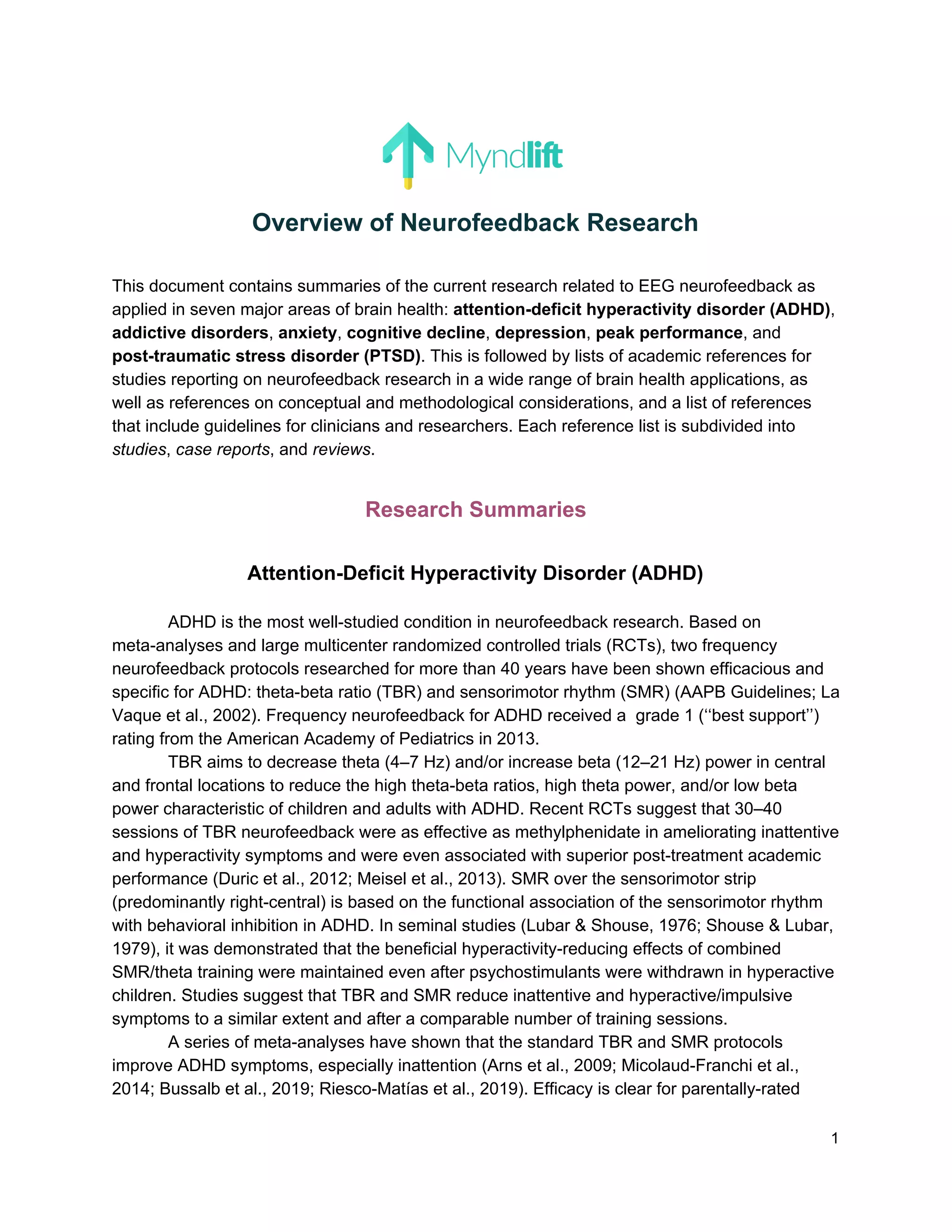 This document summarizes current research on EEG neurofeedback applied to seven areas of brain health: attention-deficit hyperactivity disorder (ADHD), addictive disorders, anxiety, cognitive decline, depression, peak performance, and post-traumatic stress disorder (PTSD). For ADHD, two neurofeedback protocols have been shown effective based on meta-analyses and large randomized controlled trials. For addictive disorders, neurofeedback has been shown to reduce addiction severity and craving as an adjunctive treatment. Neurofeedback has also been shown as an efficacious treatment for anxiety disorders. Initial evidence suggests neurofeedback may be promising for improving cognitive function in conditions like mild cognitive impairment. Protocols targeting left-frontal brain asymmetry have shown effectiveness