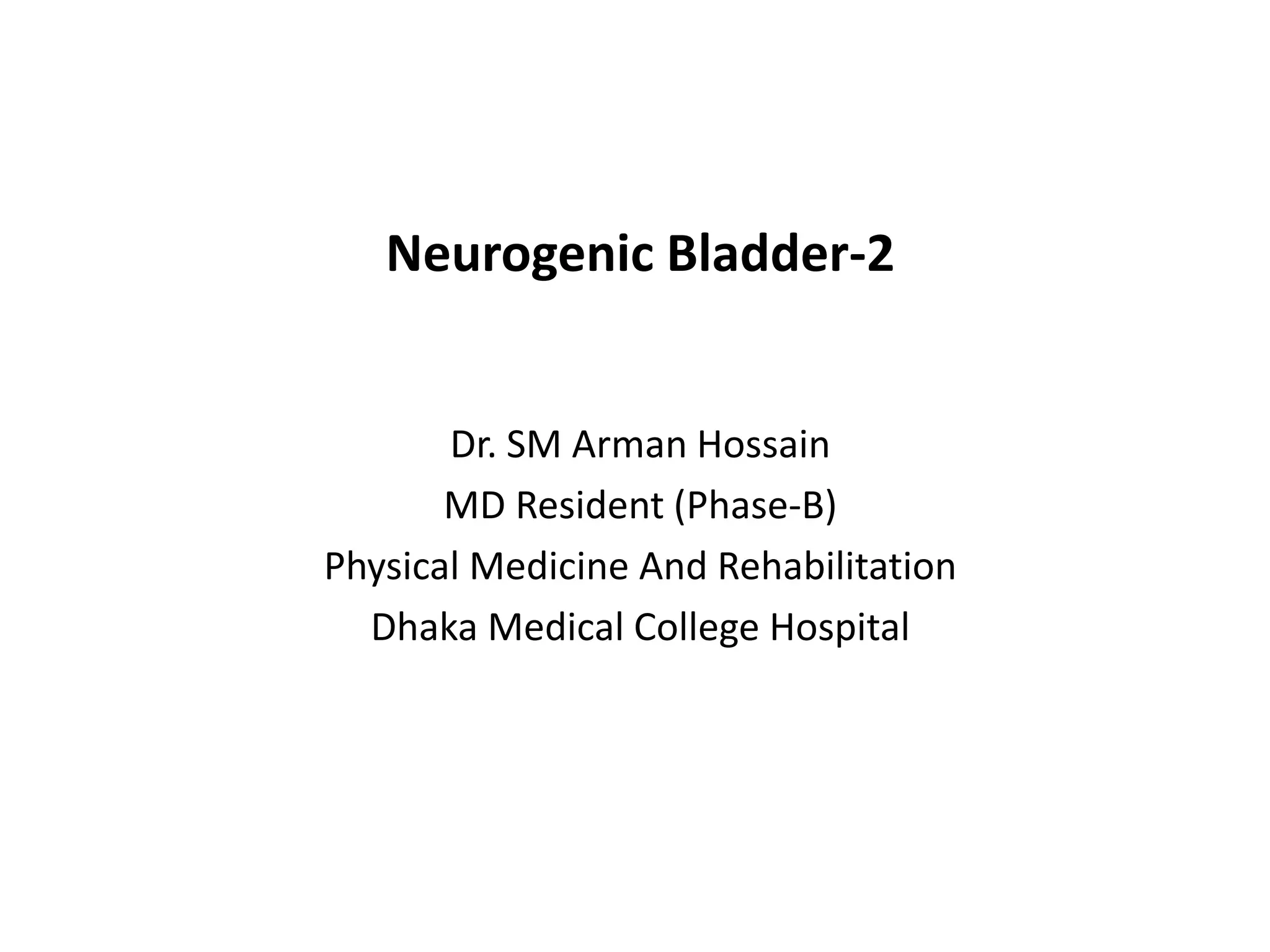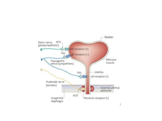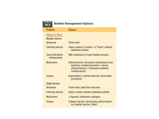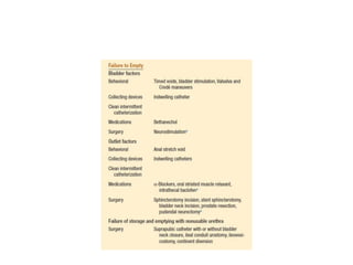 The document outlines the management of neurogenic bladder, emphasizing the goals of achieving socially acceptable bladder emptying and preventing complications related to the urinary tract. It details treatment options, including nonpharmacologic methods like timed voiding and bladder stimulation, as well as pharmacologic treatments like antimuscarinic agents. The management strategies aim to improve the overall quality of life for individuals affected by neurogenic bladder dysfunction.