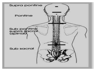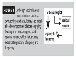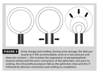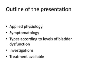 This document discusses neurogenic bladder and its management. It begins by outlining the physiology of normal bladder control and describes various types of neurogenic bladder dysfunction that can occur depending on the level of spinal cord or brain injury, including detrusor hyperreflexia, detrusor sphincter dyssynergia, and detrusor areflexia. Diagnostic investigations and treatments are then discussed, including medications, catheterization, neuromodulation, and surgeries. The goal of treatment is to balance bladder emptying and continence for each type of neurogenic bladder dysfunction.