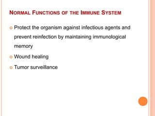 The document provides an overview of the immune system, including its normal functions, divisions, components, cells, molecules, and regulation. The key points are:
