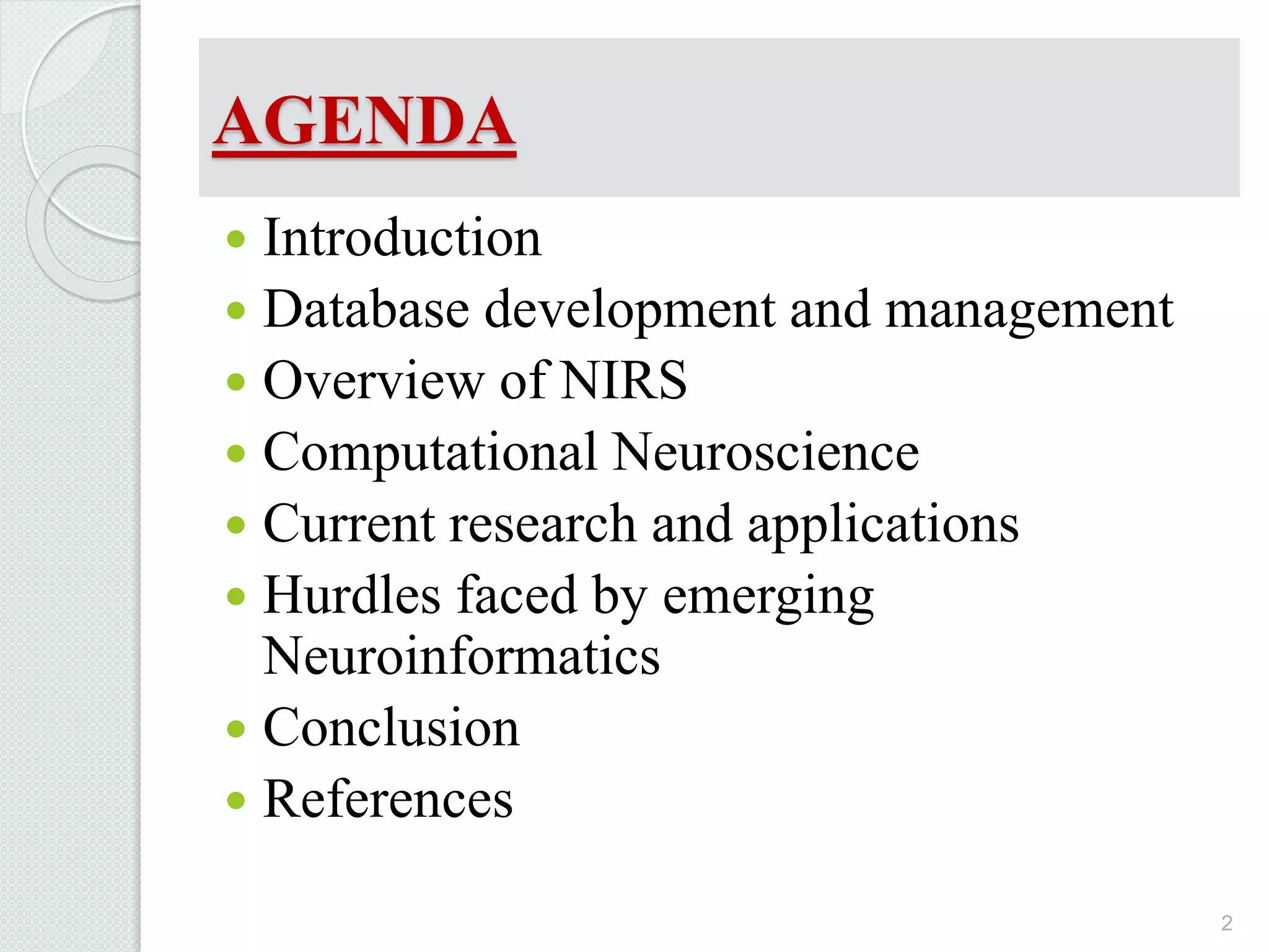 This document discusses neuroinformatics, which combines neuroscience and information science. It provides an agenda for the topics to be covered, including an introduction to neuroinformatics, database development and management, an overview of neuroimaging techniques, computational neuroscience modeling, current research applications, and challenges. Single neuron modeling approaches like Hodgkin-Huxley and cable theory are explained. Current areas of research discussed are brain-gene ontology, human brain mapping atlases, and brain-computer interfaces.