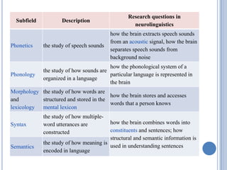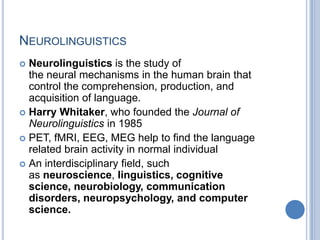 This document provides an overview of neurolinguistics, which is the study of the neural mechanisms in the human brain that control language comprehension, production, and acquisition. Some key points discussed include: