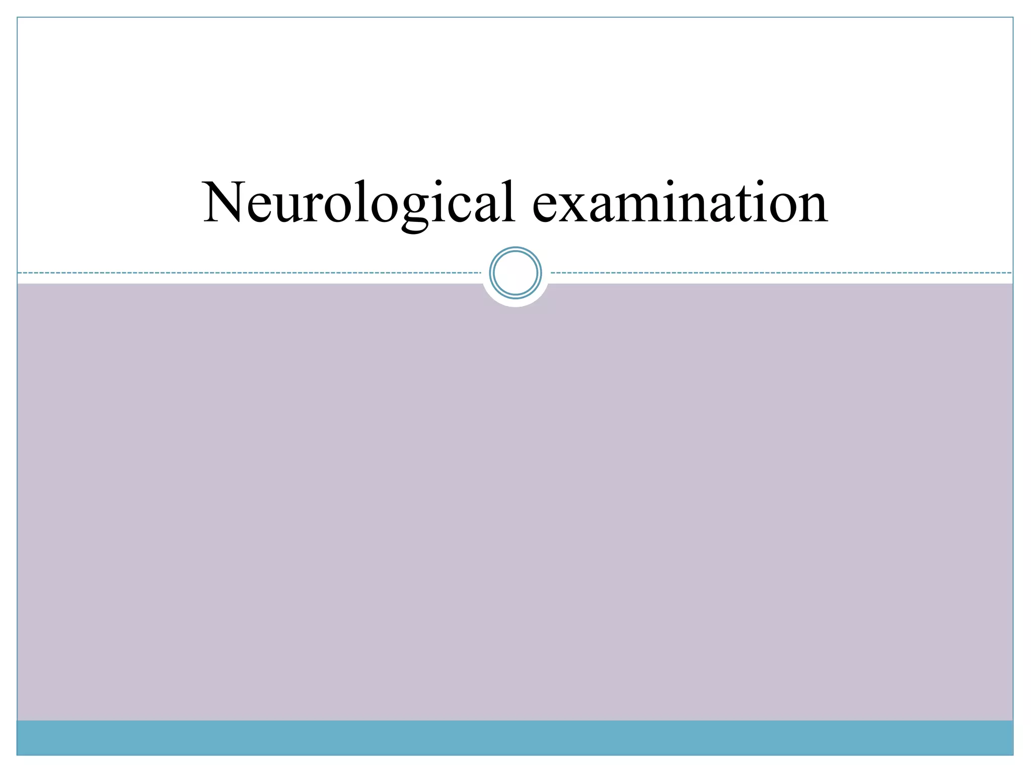 A neurological examination assesses the nervous system by testing sensory and motor responses, especially reflexes. It involves testing several areas including mental status, cranial nerves, muscle strength, gait, coordination, sensory function, and reflexes. Cranial nerve exams identify problems with the 12 cranial nerves by physical examination. A full neurological exam includes subjective and objective assessments as well as vital sign checks.