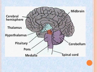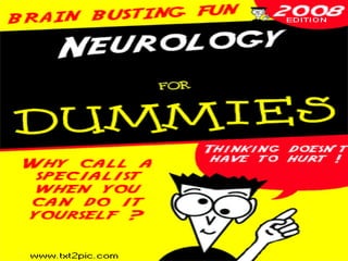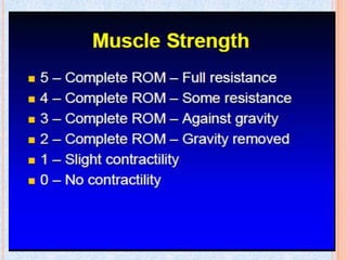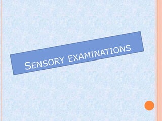 The document outlines the steps and components of a neurological examination. It includes obtaining a comprehensive health history, performing a physical exam testing vital signs, cranial nerves, motor skills, coordination, and reflexes. Neurological exams also involve assessing the patient's mental status and administering tests of sensation. The goal is to gather clinical information about any neurological abnormalities through a standardized exam process.