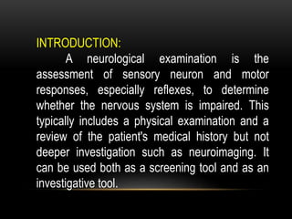 A neurological examination assesses sensory and motor responses to determine if the nervous system is impaired, involving a physical examination and patient history review. The examination's subsets include mental status, cranial nerves, motor, sensory, coordination, and reflexes, while also considering various levels of consciousness and reflex responses. It is indicated whenever neurological disorders are suspected, with specific signs and symptoms prompting detailed assessments.