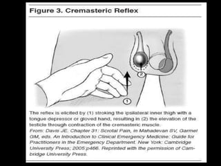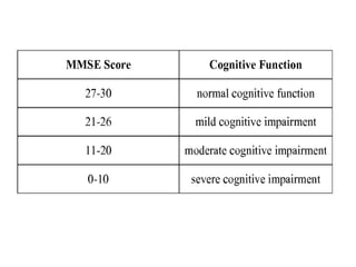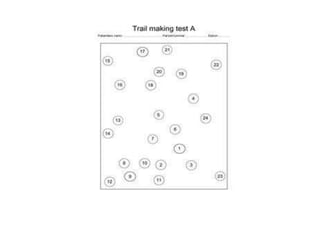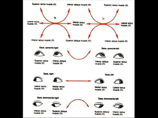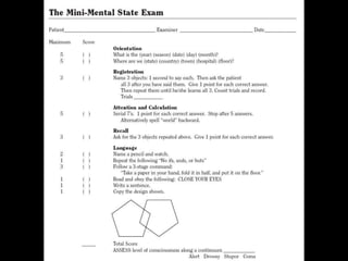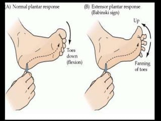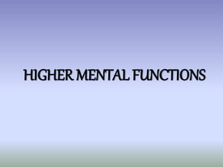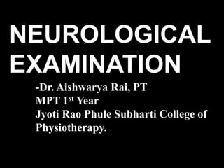 This document provides an overview of a neurological examination, including tests of higher mental functions, cranial nerves, reflexes, and sensory examination. It describes methods for testing various aspects such as level of consciousness, orientation, memory, attention, calculations, abstract thinking, insight and judgement. Specific tests are outlined for frontal lobe dysfunction and speech disorders. Each cranial nerve is discussed in terms of origin, function and testing methods. Dermatomes from C2 to T6 are defined.