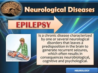 1. Epilepsy is a chronic neurological disorder characterized by recurrent seizures from abnormal neuronal activity in the brain. Common symptoms include involuntary muscle contractions and shaking. Treatment was historically based on nervous system depressants, but now focuses on newer antiepileptic drugs.