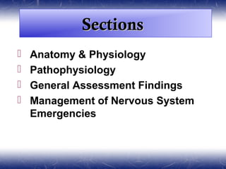 This document provides an overview of neurology, including the anatomy and physiology of the nervous system, pathophysiology of neurological disorders, general assessment findings for neurological patients, and management of nervous system emergencies. Key topics covered include structure and function of the brain and spinal cord, protective structures of the skull and spine, peripheral and autonomic nervous systems, common neurological conditions like stroke and seizures, assessment techniques, and general management principles for neurological emergencies.