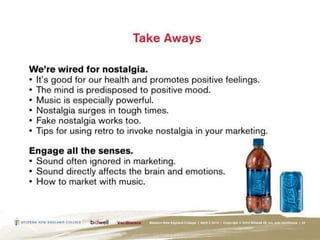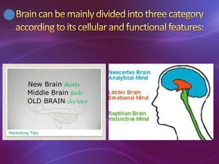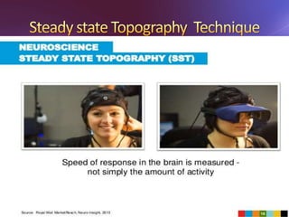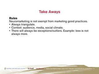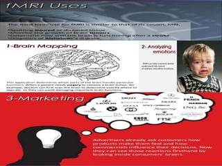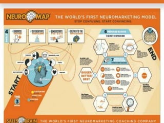 Neuromarketing is a field that uses neuroscience techniques like fMRI, EEG, and eye tracking to understand consumer decision-making by measuring brain activity in response to marketing stimuli. It aims to better meet consumer needs and inform product design, packaging, advertising, and more. Neuromarketing emerged in the 1990s and uses methods like fMRI, EEG, eye tracking, and facial coding to learn which parts of the brain are activated by different marketing elements. Both pros and cons are discussed, with pros being more reliable results from smaller samples and insights to improve marketing, while cons include potential concerns about manipulation.