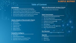 The document discusses the emerging field of neuromorphic chipsets, highlighting their potential to transform AI hardware by mimicking biological neural architectures for improved speed, power efficiency, and scalability. It covers their applications in various industries, including automotive, IoT, financial services, and medical systems, as well as the competitive landscape and patent trends within this domain. Key features enabling industry adoption are low power consumption, fault tolerance, and advanced pattern recognition capabilities.