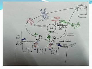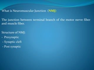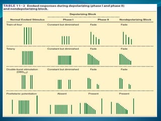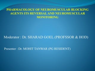 This document discusses pharmacology of neuromuscular blocking agents, their reversal, and neuromuscular monitoring. It begins by describing the neuromuscular junction and how it functions. It then discusses the mechanisms and effects of both depolarizing and non-depolarizing neuromuscular blocking agents. Specific agents like succinylcholine and atracurium are explained in detail. The document also covers neuromuscular monitoring techniques like train-of-four and how to interpret the responses. Reversal agents for neuromuscular blockade are also mentioned.