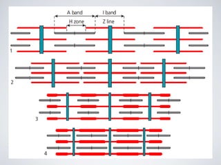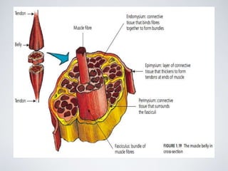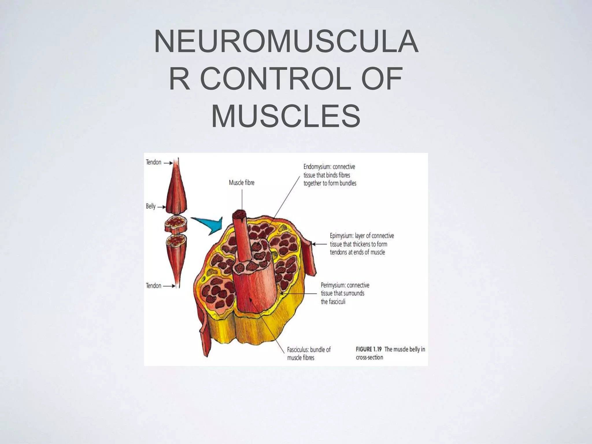 This document summarizes the neuromuscular control of muscles. It discusses how motor units consist of a motor neuron and muscle fibers, and the number of motor units depends on muscle size and function. It also describes the "all-or-nothing" principle where nerve impulses will either stimulate all fibers of a motor unit maximally or none at all. The document outlines muscle structure including fascicles, fibers, myofibrils and sarcomeres, and explains how sarcomere contraction occurs through the sliding filament mechanism of actin and myosin. It concludes with a discussion of muscle tone and how some myosin remains attached to actin, keeping the muscle partially contracted.