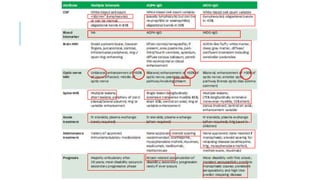 Neuromyelitis optica (NMO), also known as Devic's disease, is an inflammatory disorder characterized by demyelination of the optic nerve and spinal cord. It is associated with antibodies against aquaporin-4 (AQP4-IgG). The disease predominantly affects women and typically presents with episodes of optic neuritis and transverse myelitis. MRI often shows long extensive lesions of the spinal cord. Treatment involves high-dose steroids for acute attacks and immunosuppressants like mycophenolate mofetil or rituximab to prevent relapses. Distinguishing NMO from multiple sclerosis is important for treatment, as some therapies effective for MS may worsen NMO.