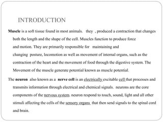 This document discusses neuron and muscle potentials. It begins by introducing muscles and neurons, explaining that muscles contract to produce movement while neurons transmit electrical and chemical signals. It then describes how neuron potentials arise from the electrochemical activity of neurons and the resting potential difference across the neuron membrane. When a neuron is stimulated, this polarity is reversed, generating an action potential. A similar process occurs in muscles - the action potential travels to the neuromuscular junction and causes the release of acetylcholine, generating a muscle action potential and contraction.