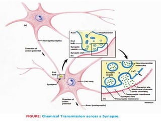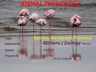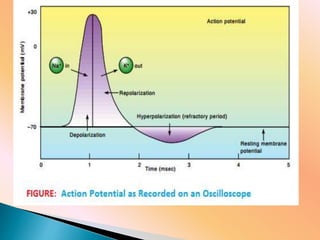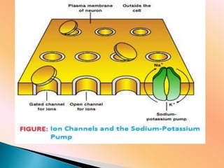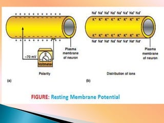 This document discusses the resting membrane potential in neurons. It explains that the plasma membrane of a resting neuron is polarized with negatively charged fluid inside and positively charged fluid outside, resulting in a resting membrane potential of around -70 mV. This polarization is maintained by the sodium-potassium pump and concentration gradients of sodium and potassium ions. When an action potential is triggered, the permeability to sodium ions increases, causing depolarization and propagating the nerve impulse down the axon.