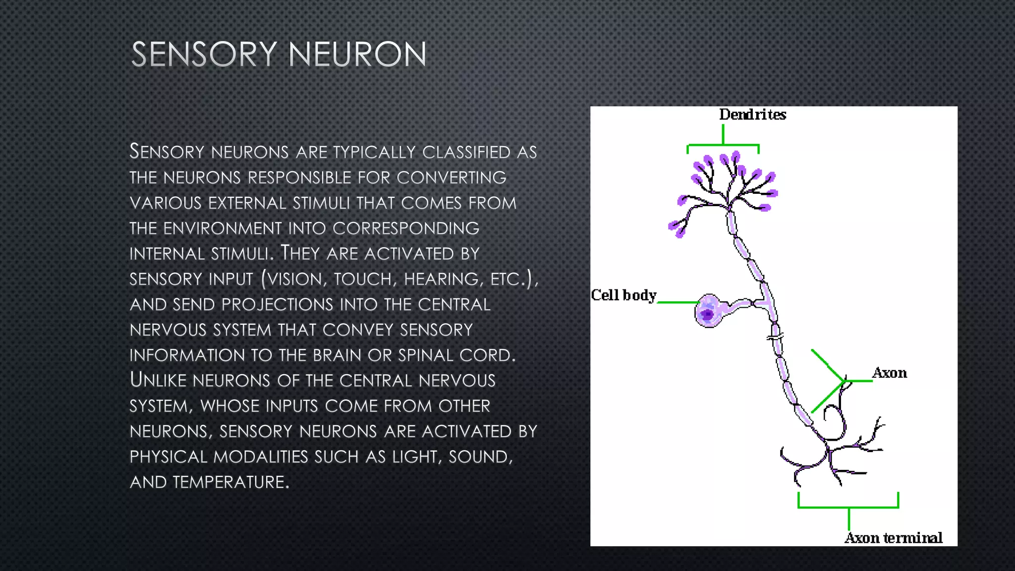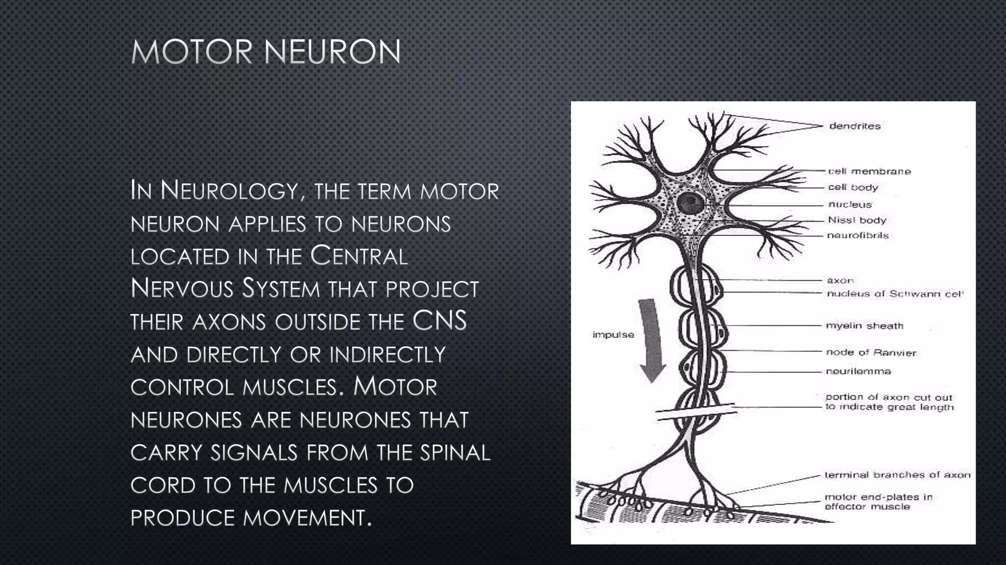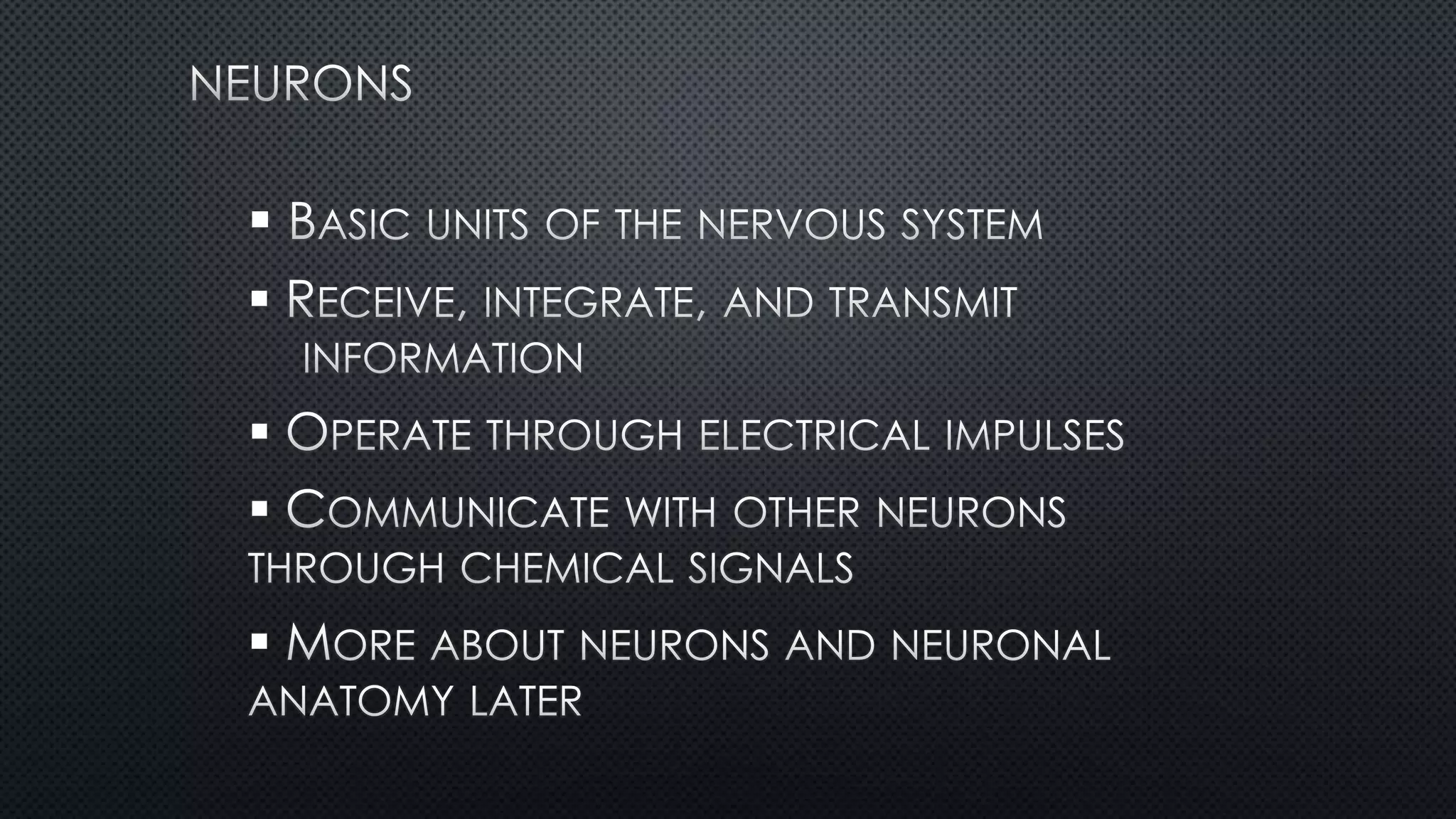 The nervous system is divided into the central nervous system (CNS) and peripheral nervous system (PNS). The CNS contains the brain and spinal cord, while the PNS contains motor and sensory neurons. The somatic nervous system controls voluntary movement through skeletal muscles and the autonomic nervous system regulates organs and smooth muscles, divided into the sympathetic and parasympathetic systems for fight-or-flight responses and maintenance.