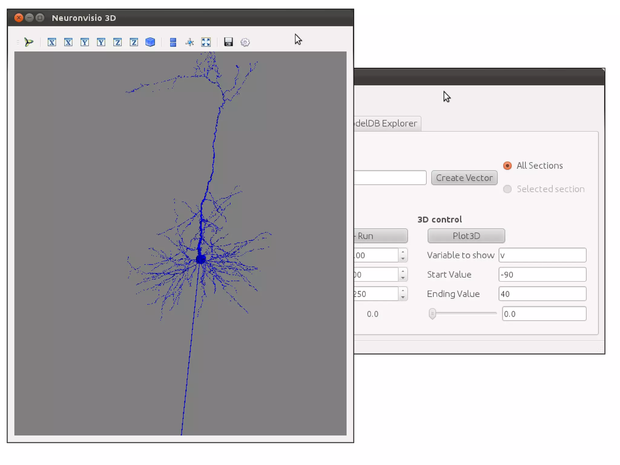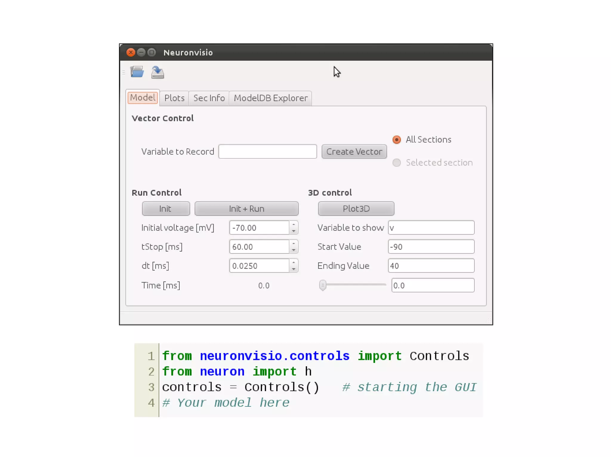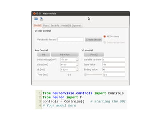 Neuronvisio is a graphical user interface for the NEURON simulator that allows users to: