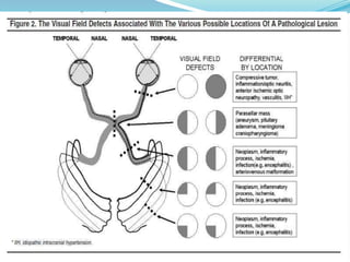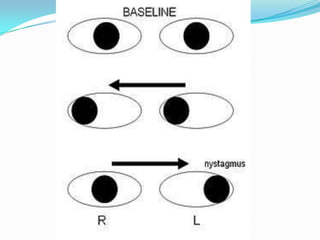This document provides an overview of eye anatomy and physiology as well as clinical assessment of the eye. It discusses the anatomy of the eyelids, muscles, nerves, and retina. It describes types of eye movements including saccades, smooth pursuit, and convergence. Reflexes like the light and accommodation reflex are also covered. The document outlines how to examine the eyes, eyelids, conjunctiva, visual acuity, fields, movements, and pupils. Causes and features of cranial nerve palsies are summarized.