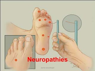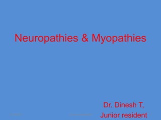 The document discusses neuropathies and myopathies, detailing their definitions, symptoms, classifications, and underlying causes. Neuropathies result from nerve damage impacting motor, sensory, and autonomic functions, with various etiologies including hereditary, metabolic, and toxic factors. Myopathies are neuromuscular disorders characterized by muscle weakness due to muscular fiber dysfunction and include several subtypes and clinical features.