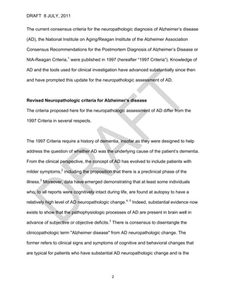 The document provides revised guidelines for the neuropathologic assessment of Alzheimer's disease (AD). Key changes from the 1997 criteria include: 1) separating the clinical diagnosis of AD from the neuropathological assessment of AD changes, 2) emphasizing the assessment of co-existing brain pathologies that may contribute to cognitive impairment, and 3) providing updated guidance on the neuropathological changes of AD and other common diseases seen in aging and dementia.