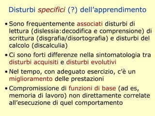 I disturbi specifici dell'apprendimento (DSA), come dislessia, disortografia e discalculia, sono diagnosticati quando le prestazioni riscontrate in test standardizzati sono significativamente inferiori rispetto alle aspettative. Questi disturbi, che non sono legati a deficit neurologici ma possono avere basi genetiche, influenzano negativamente l'autostima e i risultati scolastici dei bambini. La dislessia evolutiva, caratterizzata da problemi nella decodifica fonemica, può essere identificata da vari criteri, inclusi il livello di lettura, l'intelligenza normale e l'assenza di altre cause neurologiche.