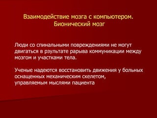Документ обсуждает взаимодействие мозга с компьютером и перспективы восстановления движений у пациентов с повреждениями спинного мозга с помощью механических скелетов, управляемых мыслями. Ученые из Университета Южной Калифорнии, включая ведущих специалистов в области нейронаук, работают над решением сложных задач, связанных с заболеваниями мозга, в мультидисциплинарной команде. Эти усилия направлены на открытие новых путей в области нейробиологии и биомедицинских технологий.