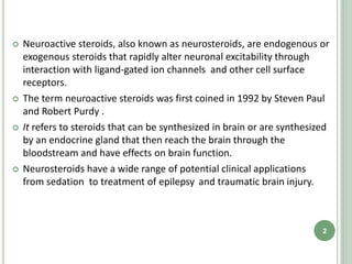 Neurosteroids are endogenous or exogenous steroids that can alter neuronal excitability through interacting with ligand-gated ion channels and cell surface receptors. They are classified as inhibitory or excitatory based on their effects. Inhibitory neurosteroids act as positive allosteric modulators of GABAA receptors, while excitatory neurosteroids negatively modulate GABAA receptors or act as agonists of NMDA or sigma-1 receptors. Neurosteroids are involved in processes like neural plasticity, learning and memory, behavior, stress response, and mood disorders. Some synthetic neurosteroids have therapeutic applications as sedatives or for treating epilepsy.