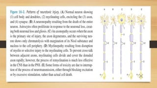Neurotoxicity can cause adverse changes in the structure or function of the central nervous system due to exposure to chemicals, physical agents, or biological factors. The nervous system is divided into the central nervous system (CNS; brain and spinal cord) and peripheral nervous system (PNS; nerves connecting CNS to body). Neurotoxicity can impact neurons, axons, myelinating cells, or neurotransmitter systems. Mechanisms include neuropathies (neuron death), axonopathies (axon degeneration), myelinopathies (myelin disruption), or toxicity associated with neurotransmitters like acetylcholine. Examples of neurotoxic agents are methyl mercury, doxorubicin, trimethyltin, pyridinethion
