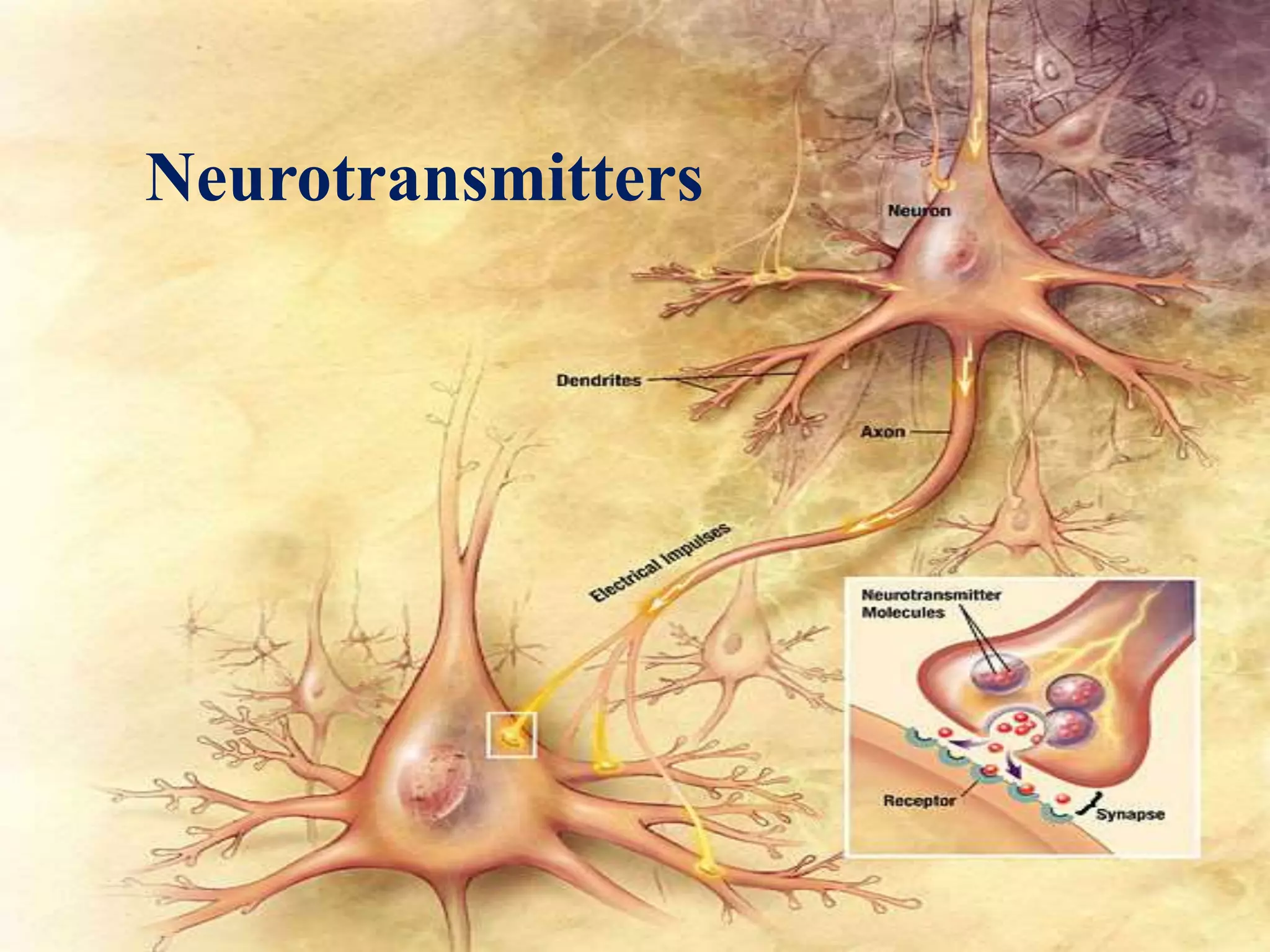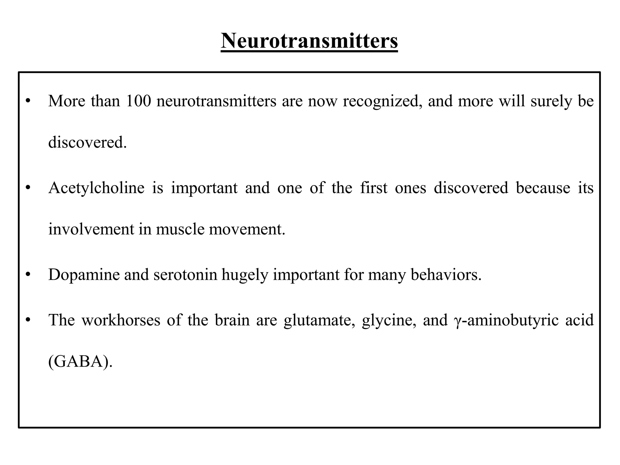 There are over 100 known neurotransmitters that transmit signals between neurons in the nervous system. The major excitatory neurotransmitters are glutamate, acetylcholine, and dopamine. Glutamate, glycine, and GABA are the primary inhibitory neurotransmitters. Acetylcholine is involved in muscle movement and is both excitatory and inhibitory depending on the receptor. Serotonin and dopamine play important roles in behaviors and mood, while GABA decreases excitatory activity in the nervous system.