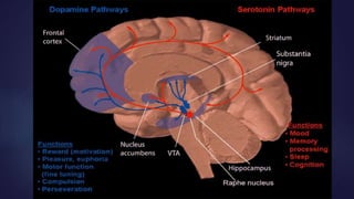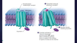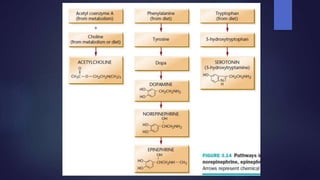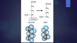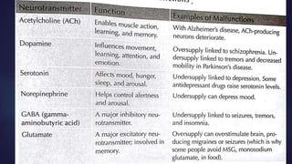 Neurotransmitters are chemical messengers that help communicate between neurons or neurons and muscles. They are classified based on their composition into small molecule transmitters like acetylcholine, amines such as dopamine and serotonin, amino acids like glutamate and GABA, and peptide or gas transmitters. Receptors are also classified as ionotropic, which allow ion flow when activated by a neurotransmitter, or metabotropic, which initiate intracellular responses. Common excitatory neurotransmitters include glutamate and acetylcholine, while inhibitory ones include GABA and glycine. Together, neurotransmitters and receptors facilitate both excitation and inhibition in the nervous system to regulate functions like movement, mood, and learning.