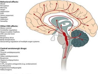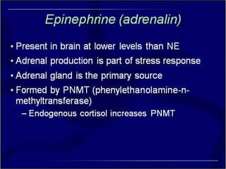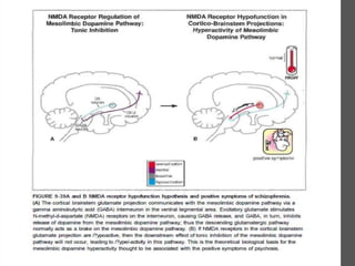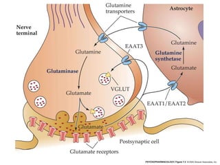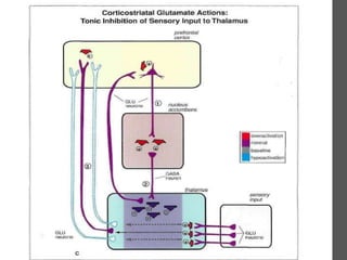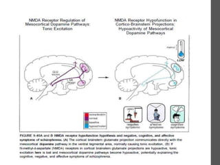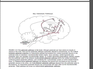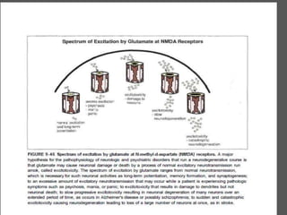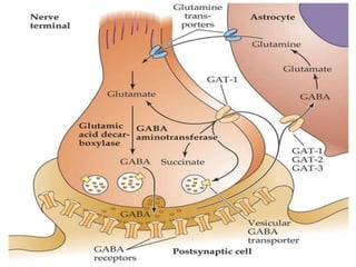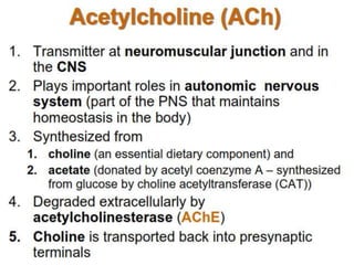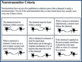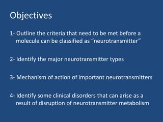 The document discusses neurotransmitters and their roles in the nervous system. It outlines the criteria for classifying a molecule as a neurotransmitter, identifies major types of neurotransmitters including amino acids, amines, and peptides. It describes the mechanism of neurotransmitter release and action, and discusses clinical disorders that can arise from disruptions in neurotransmitter metabolism such as Parkinson's disease, schizophrenia, and addiction.