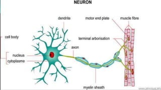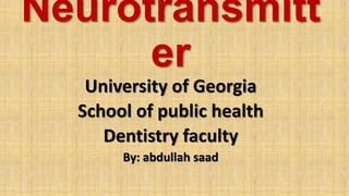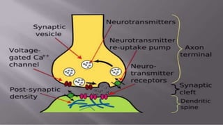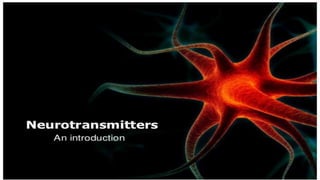 Neurotransmitters are chemicals that transmit signals between neurons. The document discusses several key neurotransmitters like acetylcholine, norepinephrine, dopamine, GABA, glutamate, and serotonin. It describes their functions and roles in processes like memory, mood, movement, and sleep. The document also outlines the criteria for classifying a chemical as a neurotransmitter and how neurotransmitters are synthesized, released, bind to receptors, and degraded once their signaling work is complete.