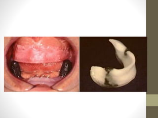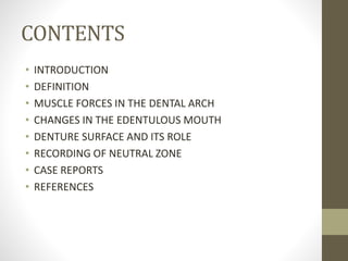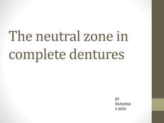 This document discusses the neutral zone in complete dentures. It defines the neutral zone as the area in the mouth where forces from the tongue pressing outward are balanced by forces from the cheeks and lips pressing inward. It describes the muscles involved and how their forces influence tooth position and denture stability. It also discusses how the edentulous mouth changes over time, increasing the importance of properly recording the neutral zone for complete denture fabrication.