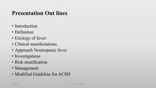 This document provides an overview of the management of neutropenic fever in pediatric patients. It defines febrile neutropenia and outlines the etiology, clinical manifestations, investigations, and risk stratification approach. Common pathogens include gram-negative bacteria like Klebsiella pneumoniae and Escherichia coli. Investigations include blood cultures, urine analysis and culture if indicated, and chest x-ray only for symptomatic patients. Risk stratification divides patients into high-risk and low-risk categories based on factors like symptoms, anticipated neutropenia duration, and underlying condition. High-risk patients require hospital admission.