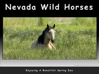 This document appears to be a collection of photographs taken by Thomas Bruno of wild horse bands in Nevada, including the Apache Band, Lobo Band, and Comanche Band. The photographs depict the horses grazing, drinking from creeks, interacting with each other, and going about their daily lives on the open range. The collection serves to document and bring awareness to preserving wild horses in Nevada.