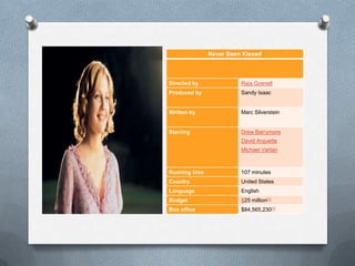 Never Been Kissed is a 1999 romantic comedy film directed by Raja Gosnell and written by Marc Silverstein. It stars Drew Barrymore as Josie Geller, a copy editor who goes undercover at a high school for a story. The film was a box office success, grossing $84 million against a $25 million budget. Barrymore won an award for her comedic performance in the film.
