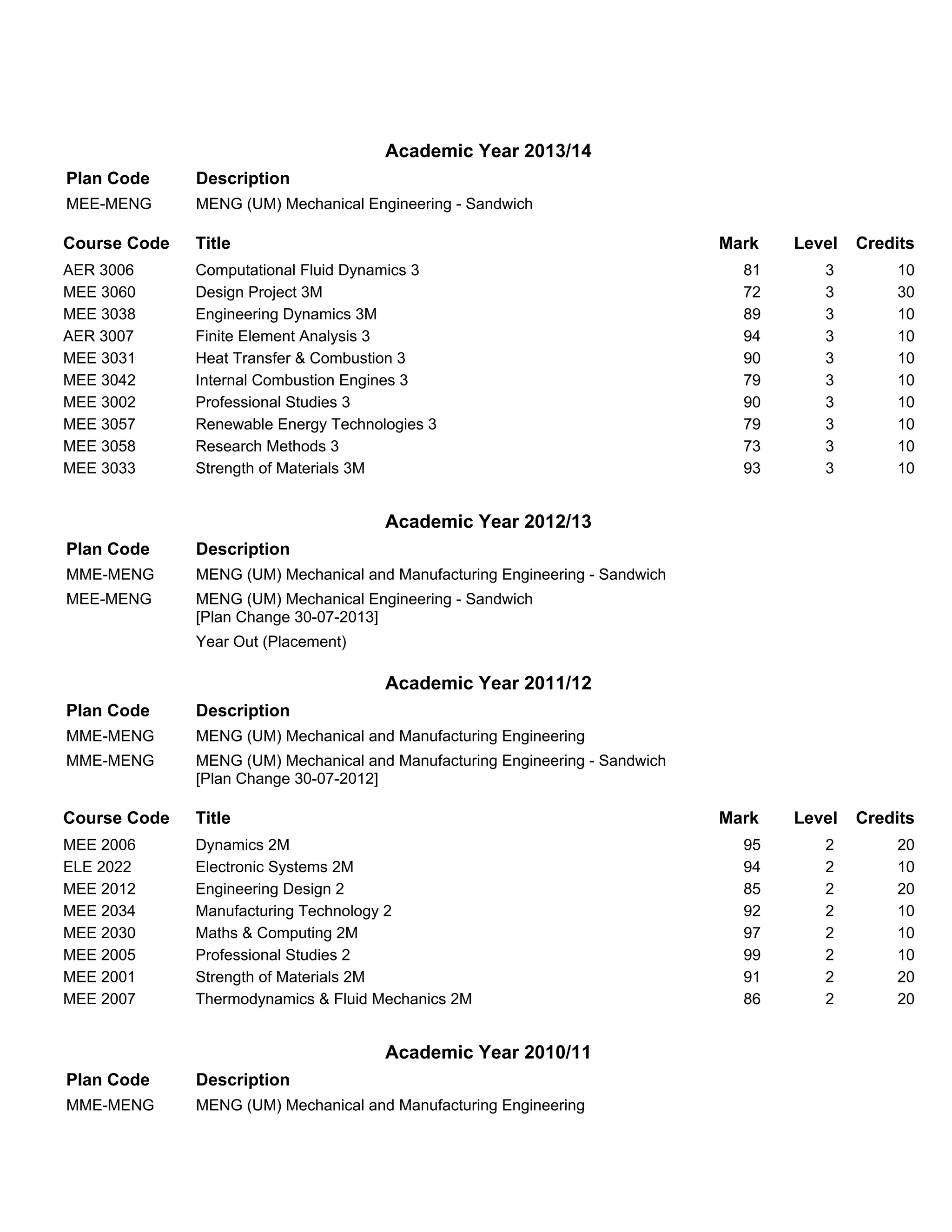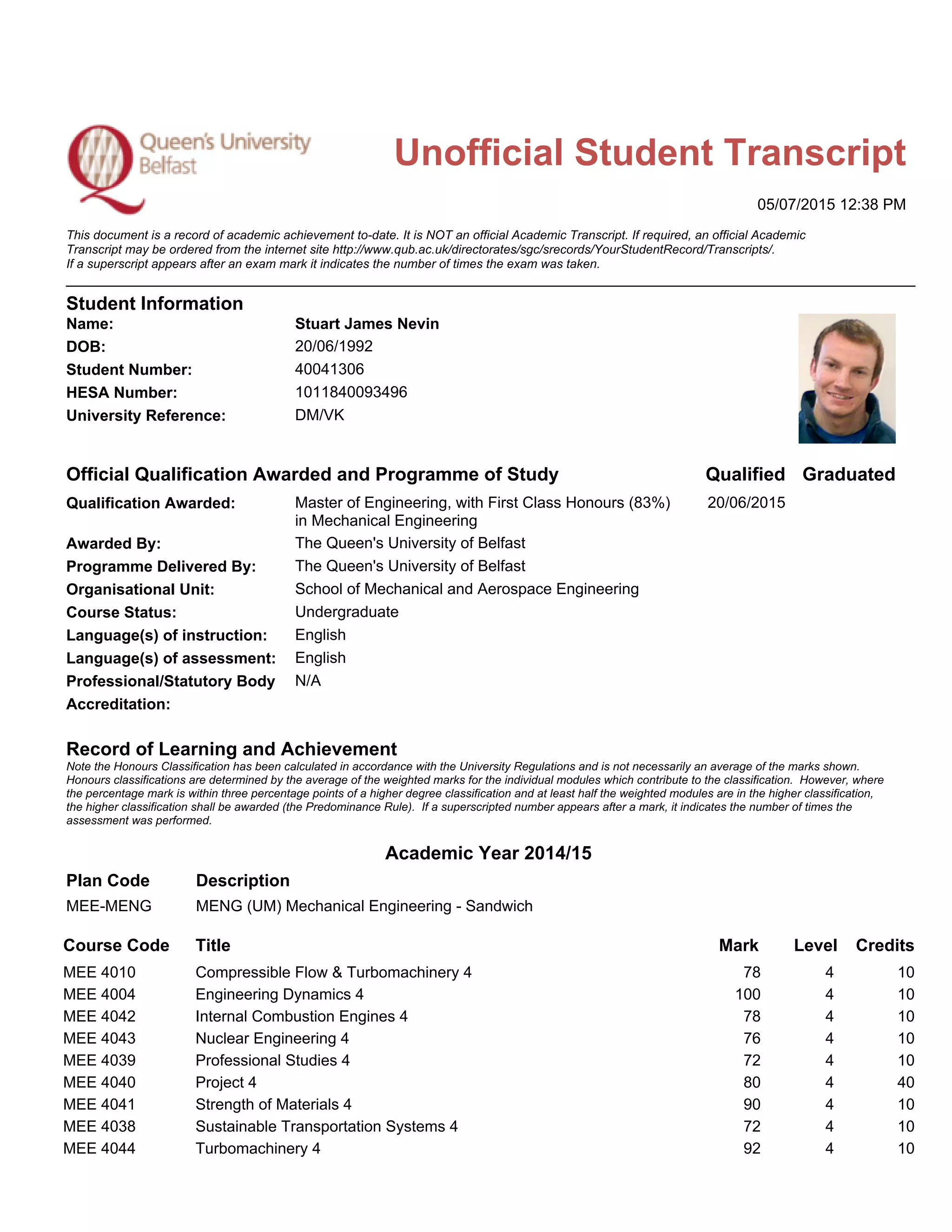 This unofficial student transcript summarizes Stuart James Nevin's academic record and achievement in obtaining a Master of Engineering in Mechanical Engineering from The Queen's University of Belfast. It details his course of study from 2010 to 2015, including marks obtained in modules across 6 academic years of undergraduate and postgraduate study in Mechanical and Manufacturing Engineering and Mechanical Engineering. The transcript notes that Stuart graduated with First Class Honours and was awarded his Master's degree in June 2015.