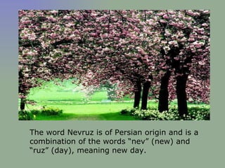 Nevruz is a Persian new year celebration that marks the first day of spring. It is believed to be a holy day where all creatures pay respect to God. People prepare for the new year by wearing new clothes and sharing meals and visits with one another. Traditions include collecting stones from graves to make wishes, laying tables with foods, playing games, and lighting bonfires. Nevruz is celebrated across Central Asia and the Middle East in ways unique to each society.