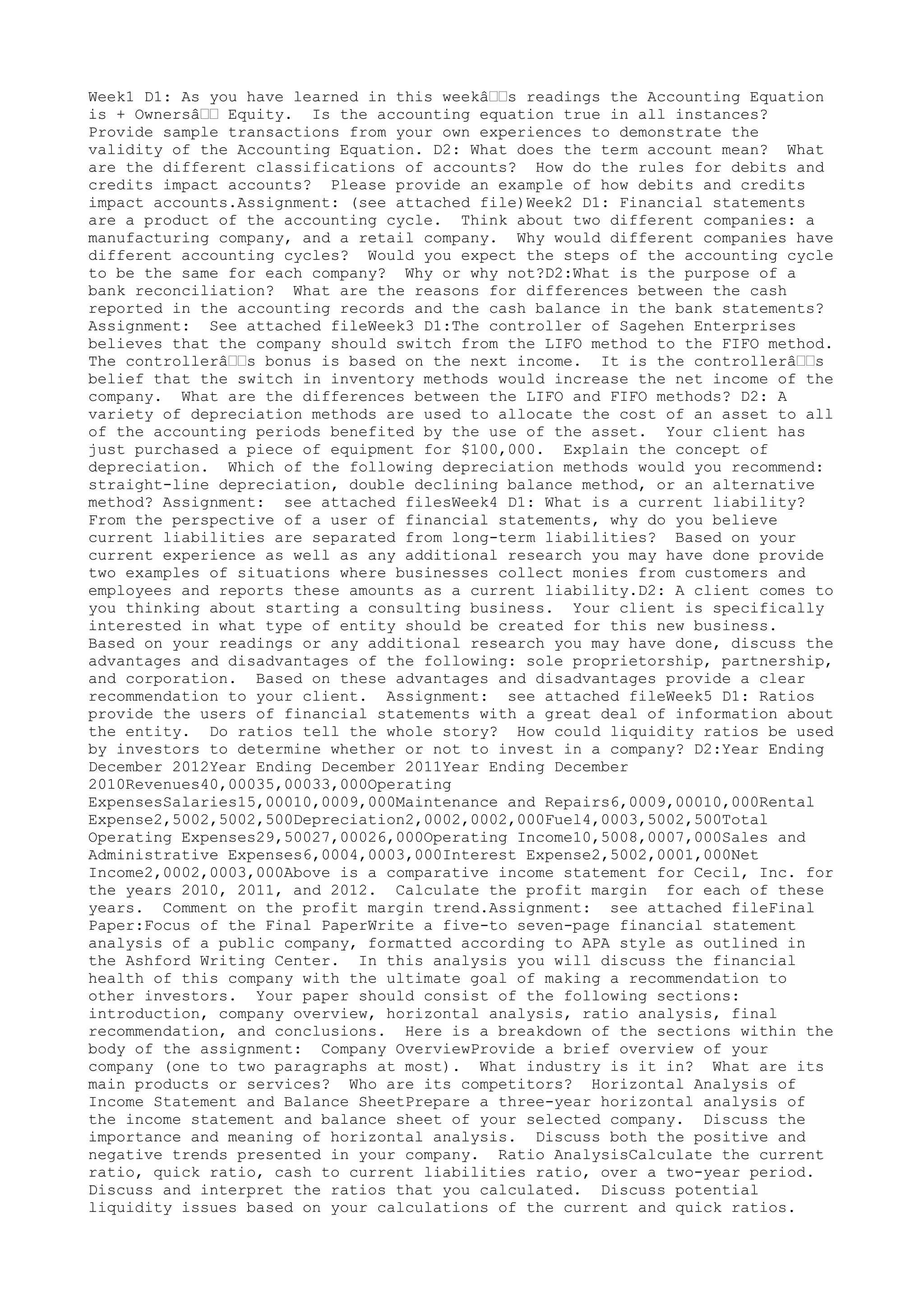 This document outlines the weekly discussion topics and assignments for a course on accounting. In week 1, students are asked to demonstrate the accounting equation using personal transactions and to define accounts and debits and credits. Week 2 discusses differences in accounting cycles for various companies and the purpose of bank reconciliations. Week 3 covers the differences between LIFO and FIFO inventory methods and depreciation. Week 4 defines current liabilities and discusses entity types. Week 5 analyzes ratios and profit margins. The final paper involves a financial statement analysis of a public company to make an investment recommendation.