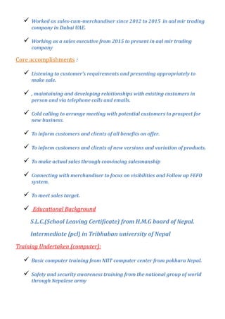 Yam Bahadur Rana Bhat is seeking a challenging sales role that allows him to utilize his communication, interpersonal, and customer service skills. He has over 15 years of professional experience, including 5 years in the Nepalese army and over 10 years in sales and merchandising roles in Qatar and Dubai. His experience includes prospecting new customers, maintaining relationships, meeting sales targets, and providing product information. He is proficient in English, Hindi, and Nepali and has a valid UAE driver's license.