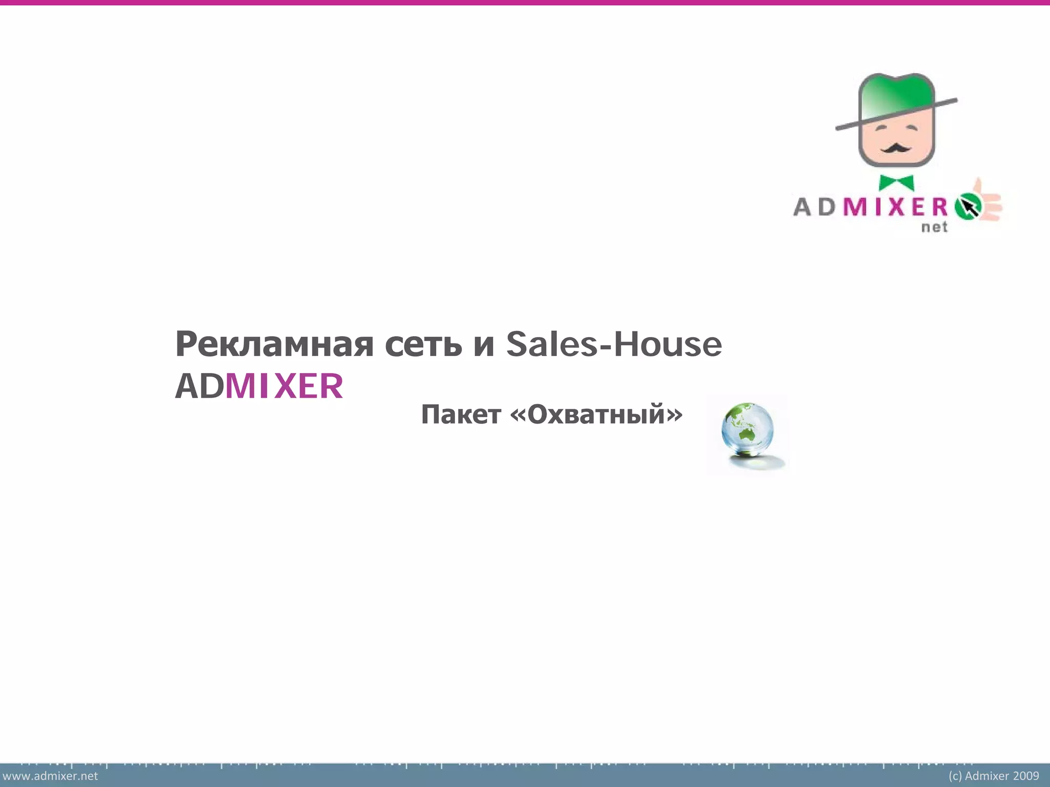 Пакет 'охватный' рекламной сети 'адмиксер' предлагает максимальный охват украинской аудитории с аудиторией в 6 671 000 пользователей и охватом 53,67%. Он включает 106 сайтов, каждый из которых посещает более 50 000 уникальных пользователей в месяц, и все ресурсы участвуют в исследовании gemius audience. Документ также содержит демографическую информацию о пользователях и список сайтов, входящих в пакет.
