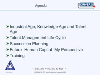 The document discusses talent management and succession planning. It outlines the traditional approach to succession planning versus a new approach focused on business needs. It also discusses moving from the industrial age to the knowledge age and talent age, and the talent management life cycle of planning, evaluating, acquiring, retaining, engaging, leading, developing, and deploying talent. Training is also addressed as part of the talent management process.